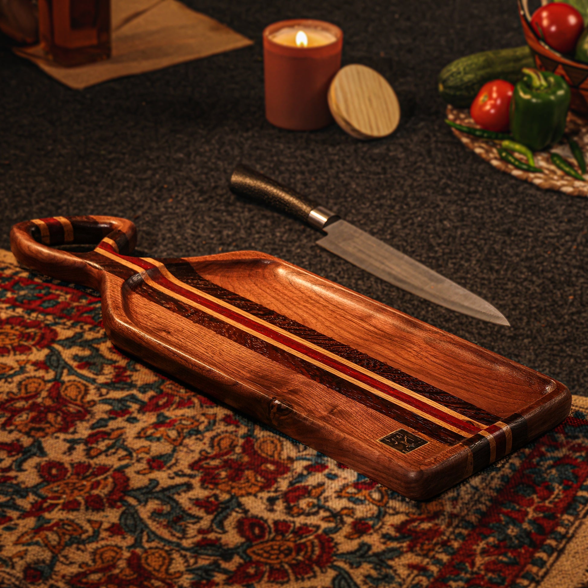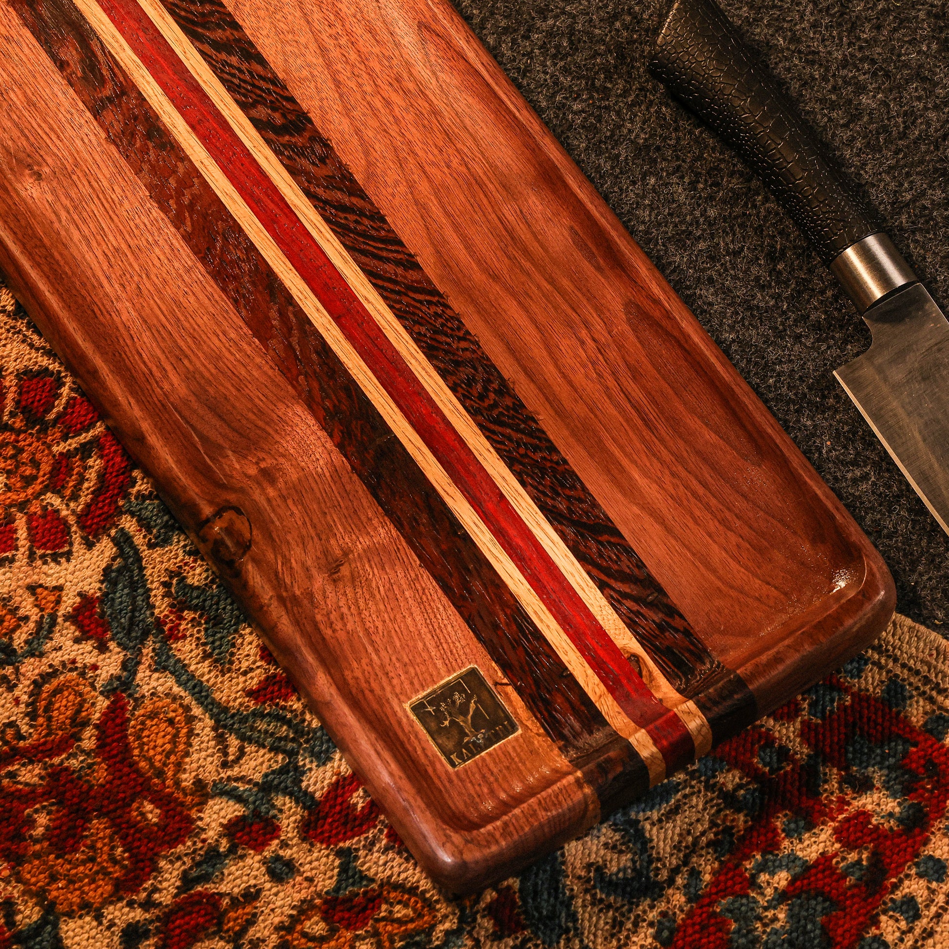 Enhance your kitchen with Kalatri's handmade cheese platter, expertly crafted from premium English woods like White Oak, Wenge, African Padauk and American Walnut. This versatile board serves as both an elegant cheese platter and a dependable serving tray. Finished with food-safe oil, it presents your finest dishes safely and stylishly, adding sophistication to your space.