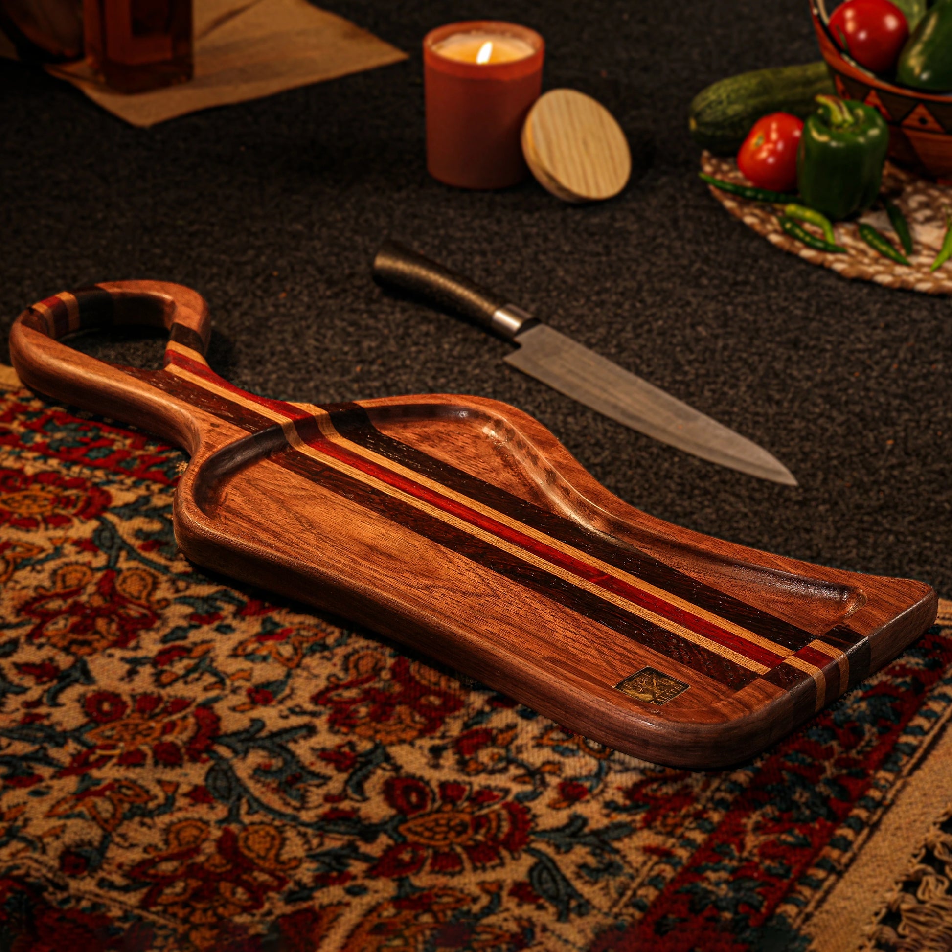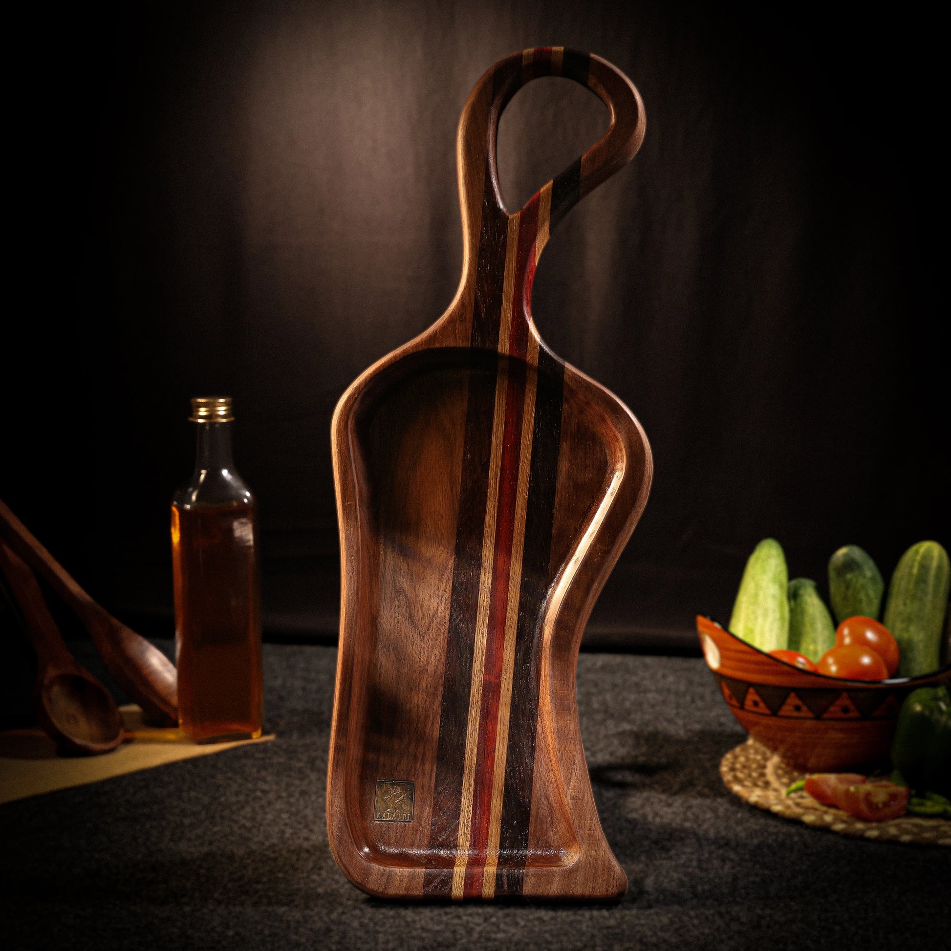 Elevate your culinary journey with Kalatri’s handcrafted serving board, made from American Walnut, Wenge, White Oak and African Padauk. This versatile board serves as both an elegant cutting surface and a dependable serving platter. The smooth lines and ergonomic handle ensure effortless use, making it a stunning addition to any kitchen. Finished with food-safe oil, this board promises a moisture-resistant, long-lasting shine. Designed to last, it features reinforced joints with Germany-imported D3 adhesive, ensuring a sturdy build.