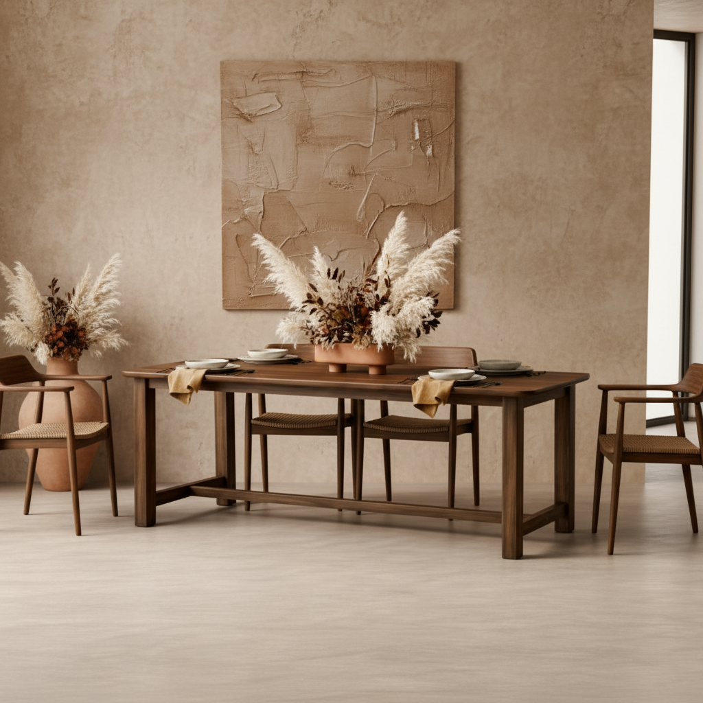 Rooted in traditional woodworking principles, the Cross Rail Table combines time-tested construction with refined modern aesthetics. Crafted from solid Teak Wood and finished in Walnut, the tabletop highlights natural grain variation and organic warmth.
