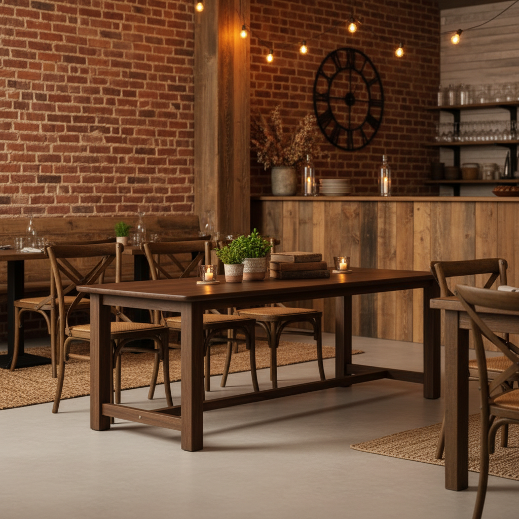 The cross-rail support beneath the surface adds structural integrity while introducing a subtle rustic character. This thoughtful construction ensures stability and longevity, making the table suitable for both everyday use and statement settings.