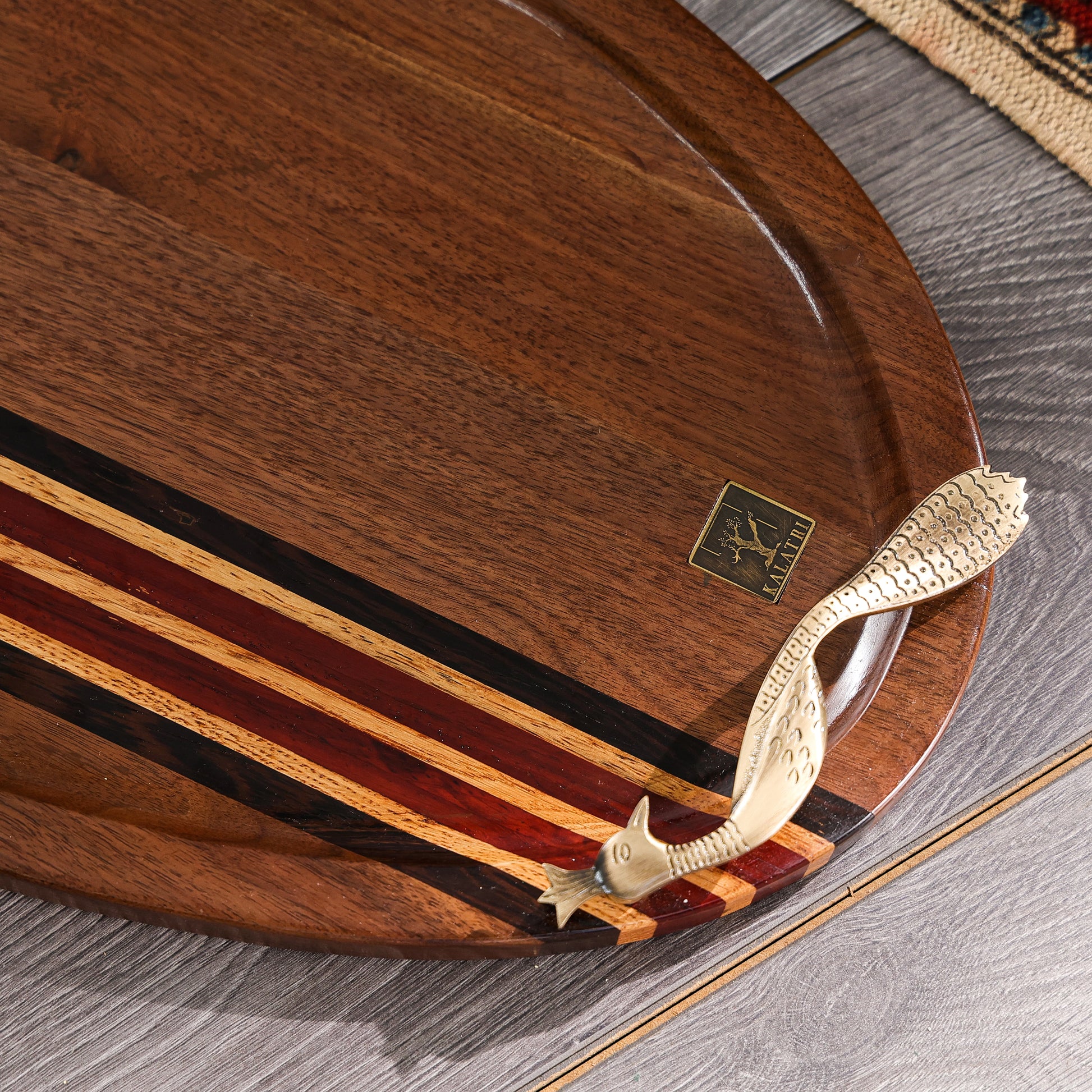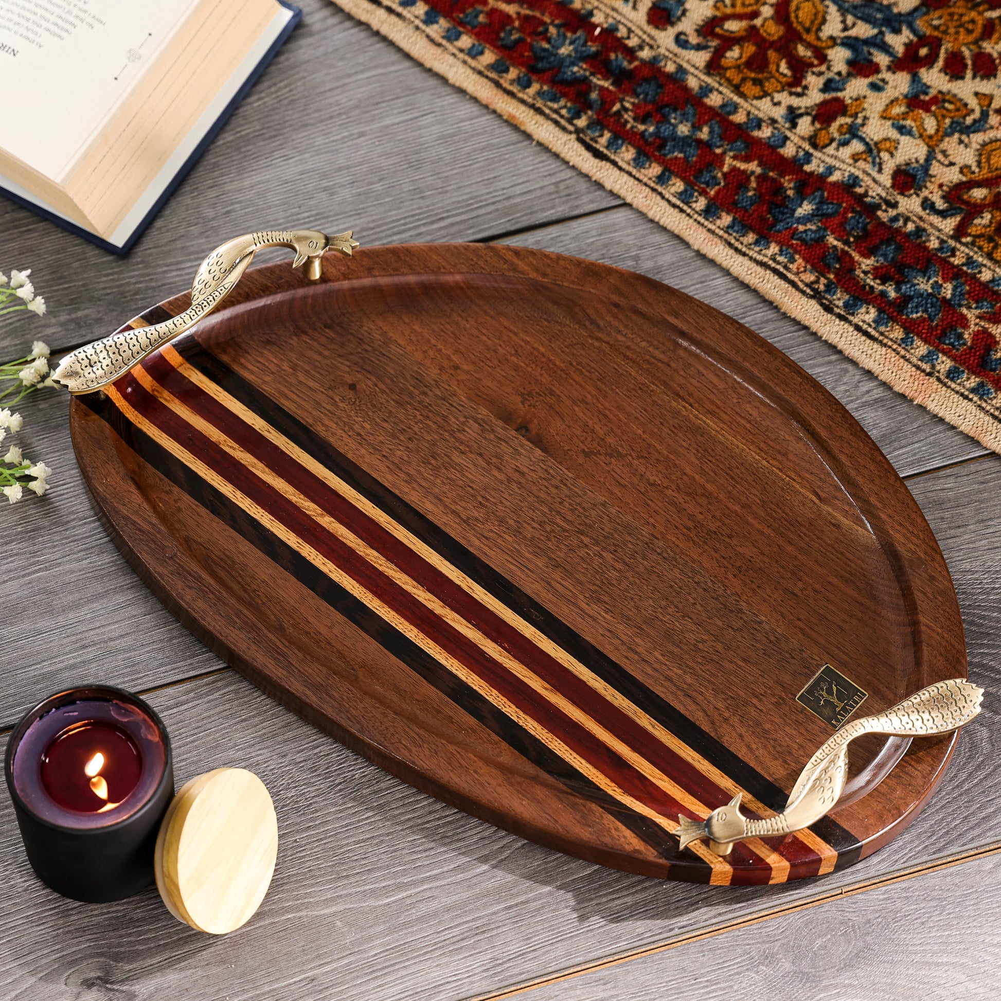 Impress your guests with Kalatri’s handcrafted Serving Tray, made from imported English wood. Featuring elegant brass peacock handles and a smooth edge-grain surface, this tray combines beauty with durability. Perfect for serving appetisers and delicacies, it adds a touch of timeless style to any gathering and dining space.